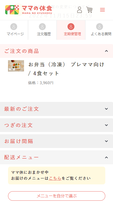 マイページでは、お好きなメニューの選択、注文履歴の閲覧、配送スケジュールの確認・変更が可能です。